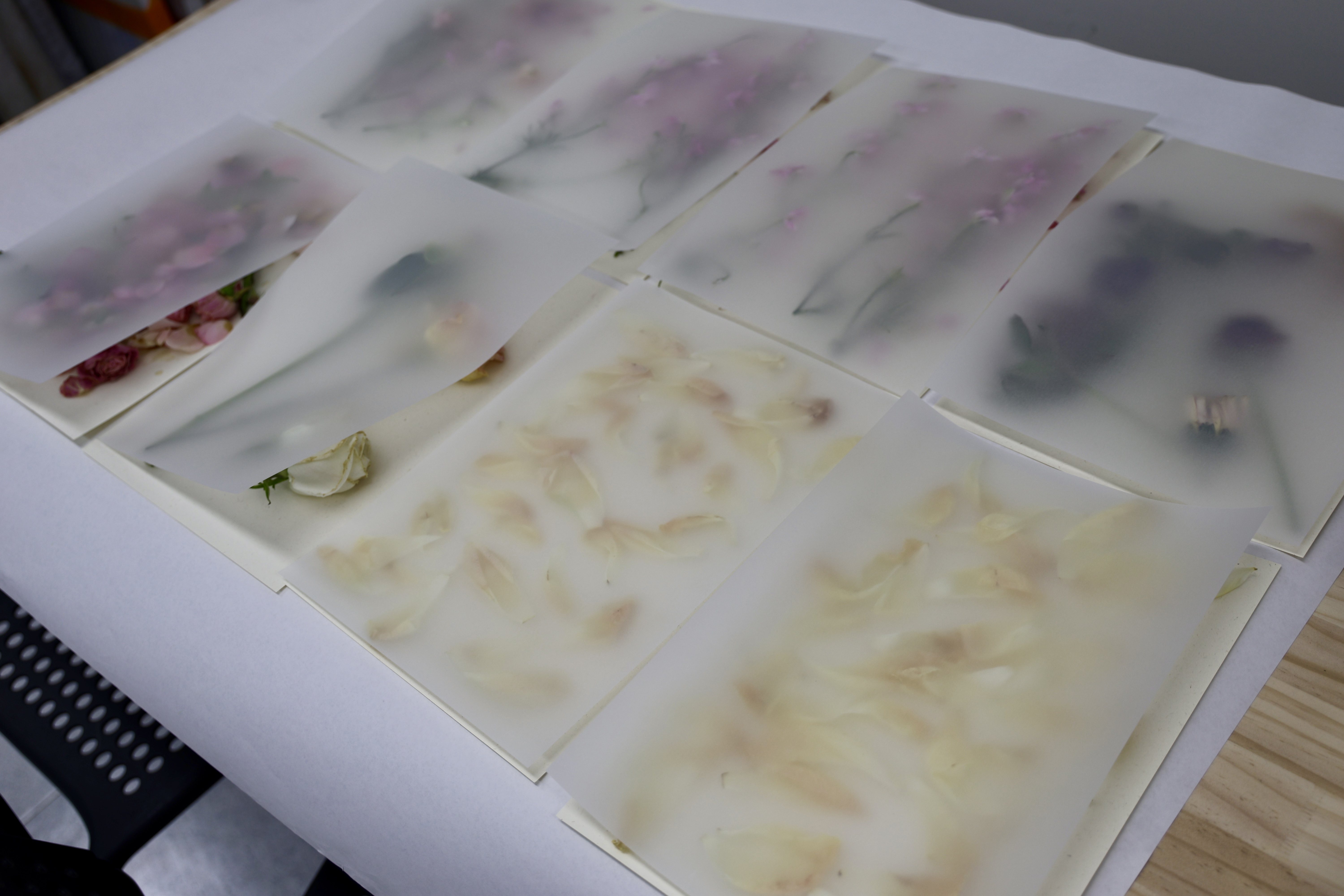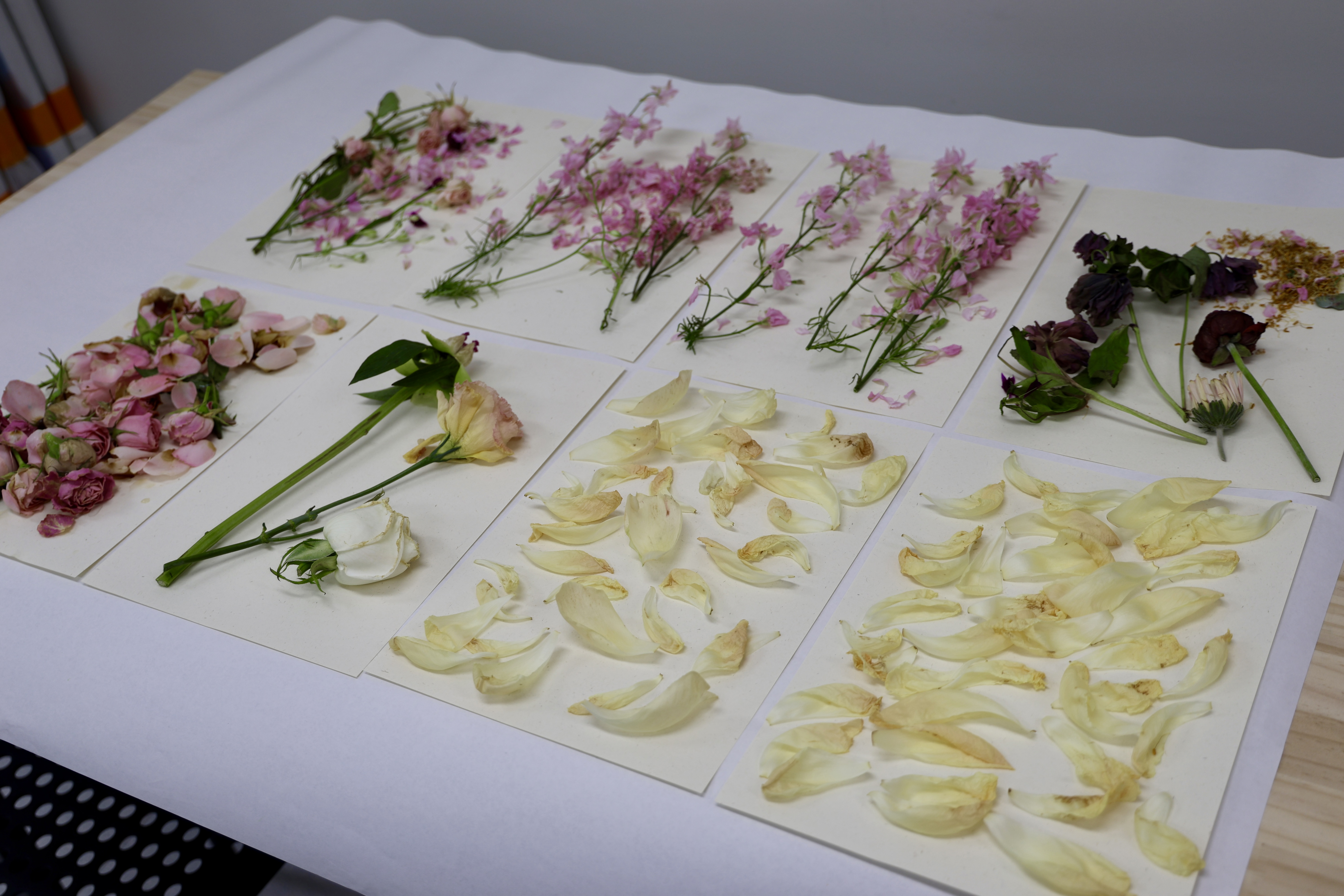 오프닝 파티가 끝난 후, 꽃들을 종류별로 정리하고 눌러서 말렸습니다. 피어있던 것이 워크숍의 원재료가 됩니다.